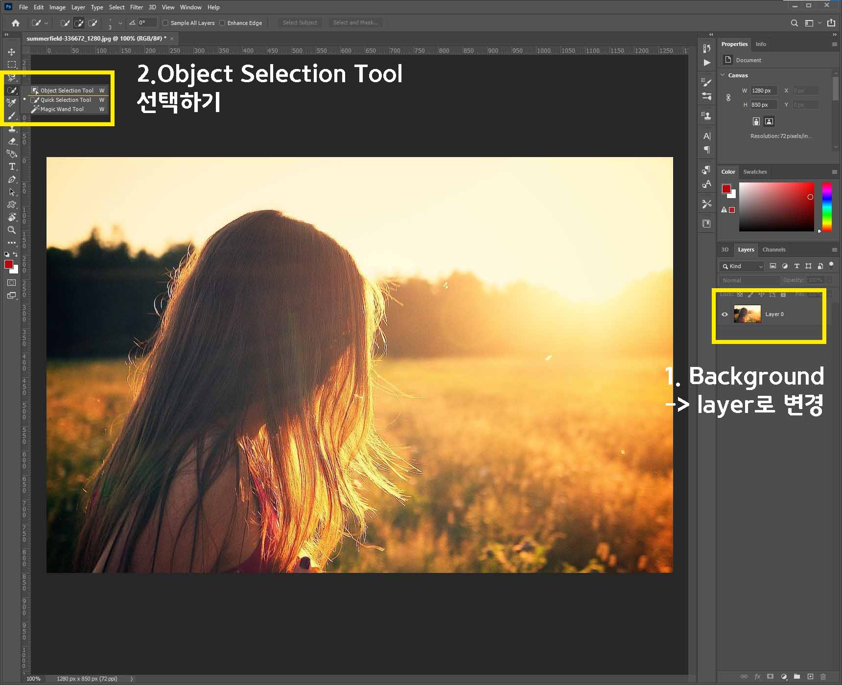 우선 불러온 파일을 Background -> layer로 변경해 주세요.