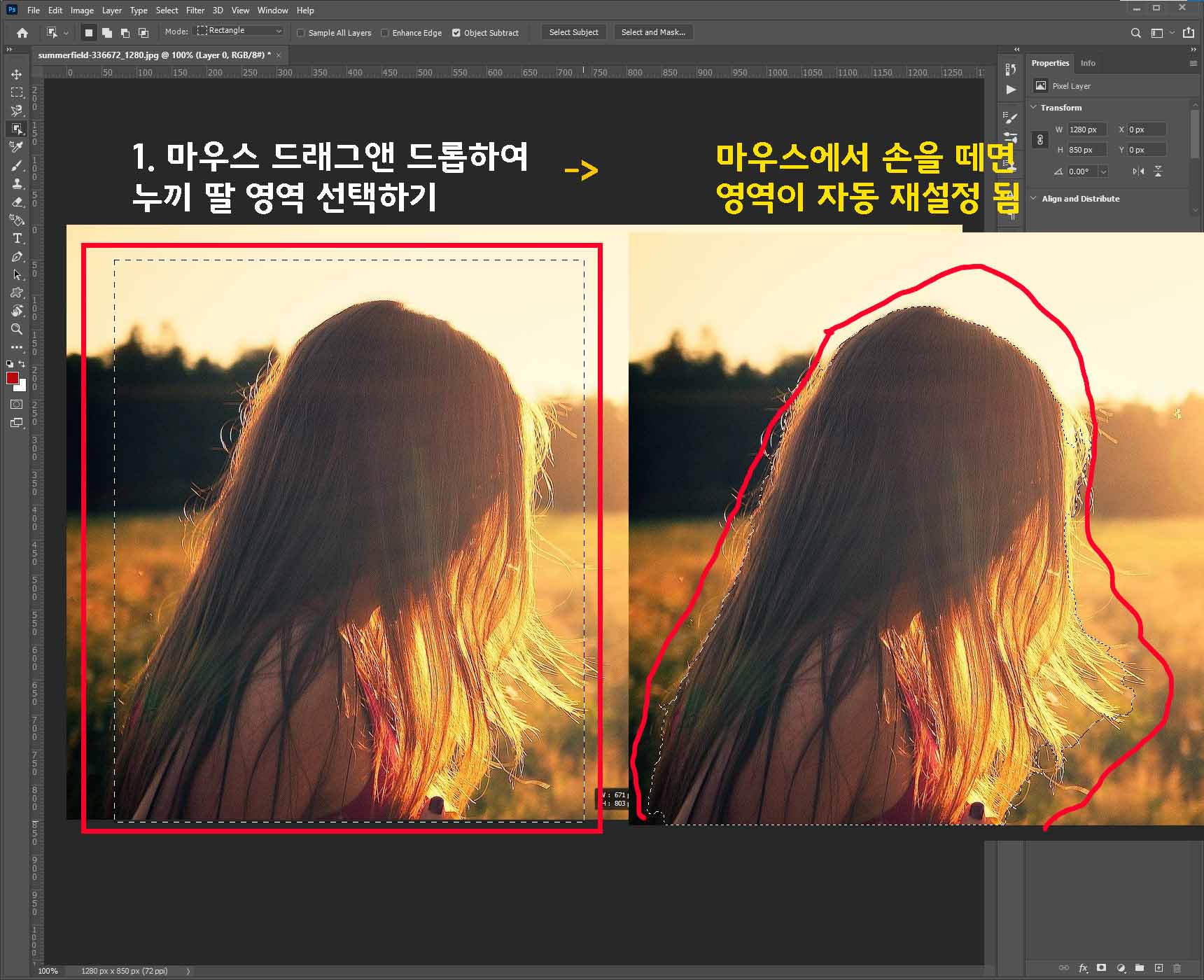 누끼를 딸 머리카락 소스 영역을 마우스로 그래그 앤 드롭하여 영역을 선택하여 주세요.