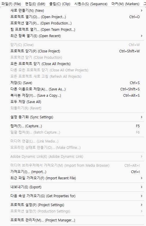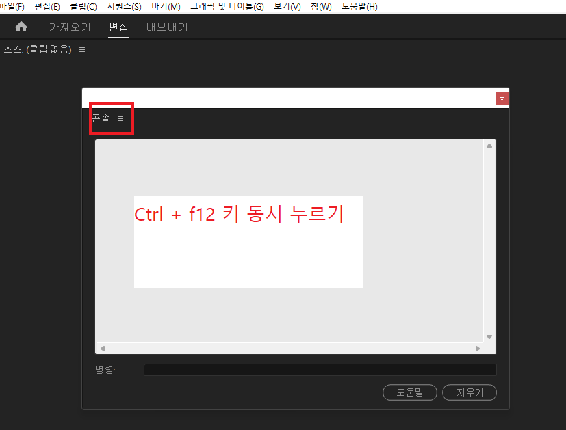 - 콘솔창 닫기 > 프로그램 닫기 > 프리미어 프로를 재실행하면 영문과 한글이 동시에 메뉴에 표기가 됩니다.