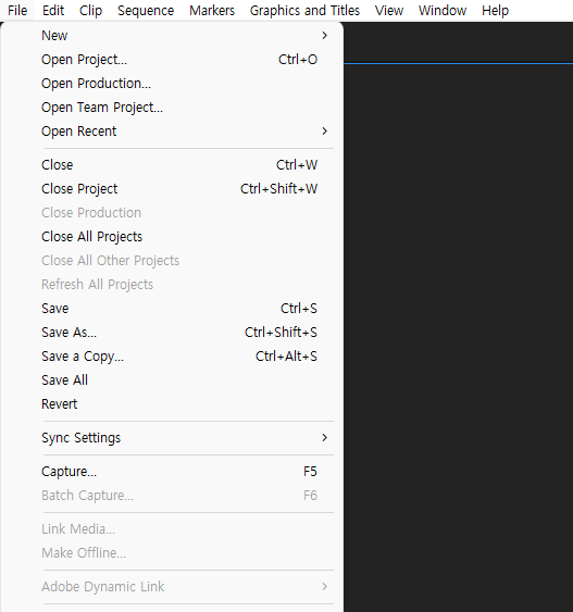 - 프리미어 프로 실행 후 아무 파일이나 오픈합니다.