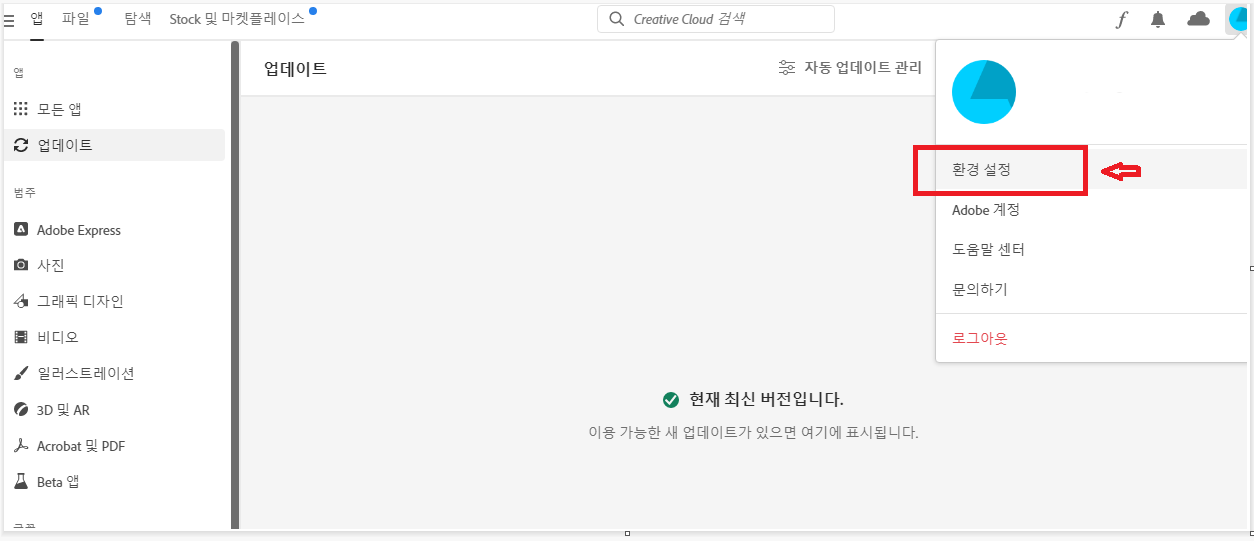 - 우측 상단의 계정창을 클릭하여 환경 설정 클릭 후,