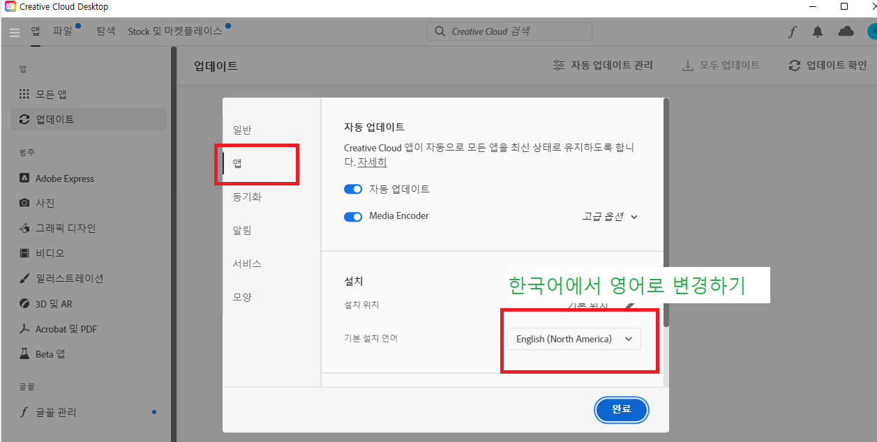 - 앱 내에 설치 > 기본 설치 언어 :English (North America) > 완료를 클릭합니다.