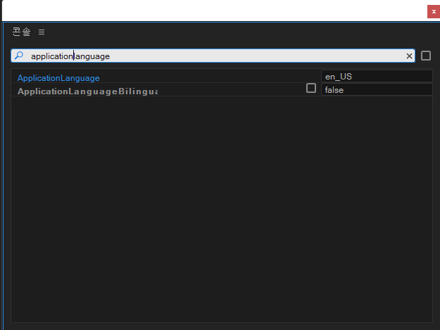 - 검색창에 applicationlanguage 입력하면 필터가 적용이 되고, 기존 ko_KR 된 창에 en_US로 타이핑하여 바꿔주세요. 주의점은 영문 대소문자를 구분해서 적어주세요. 전부 소문자로 입력 시 적용이 되지 않습니다.